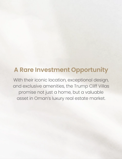 Rising 130 meters above the ocean, the Trump Cliff Villas in Muscat, Oman, offer a rare harmony of natural beauty and modern luxury. This exclusive collection of fully furnished 3-bedroom villas is a masterpiece of design, created in collaboration with DarGlobal, OMRAN Group, and The Trump Organization. With breathtaking cliffside views, these residences provide a serene retreat while remaining close to the vibrant heart of Muscat.